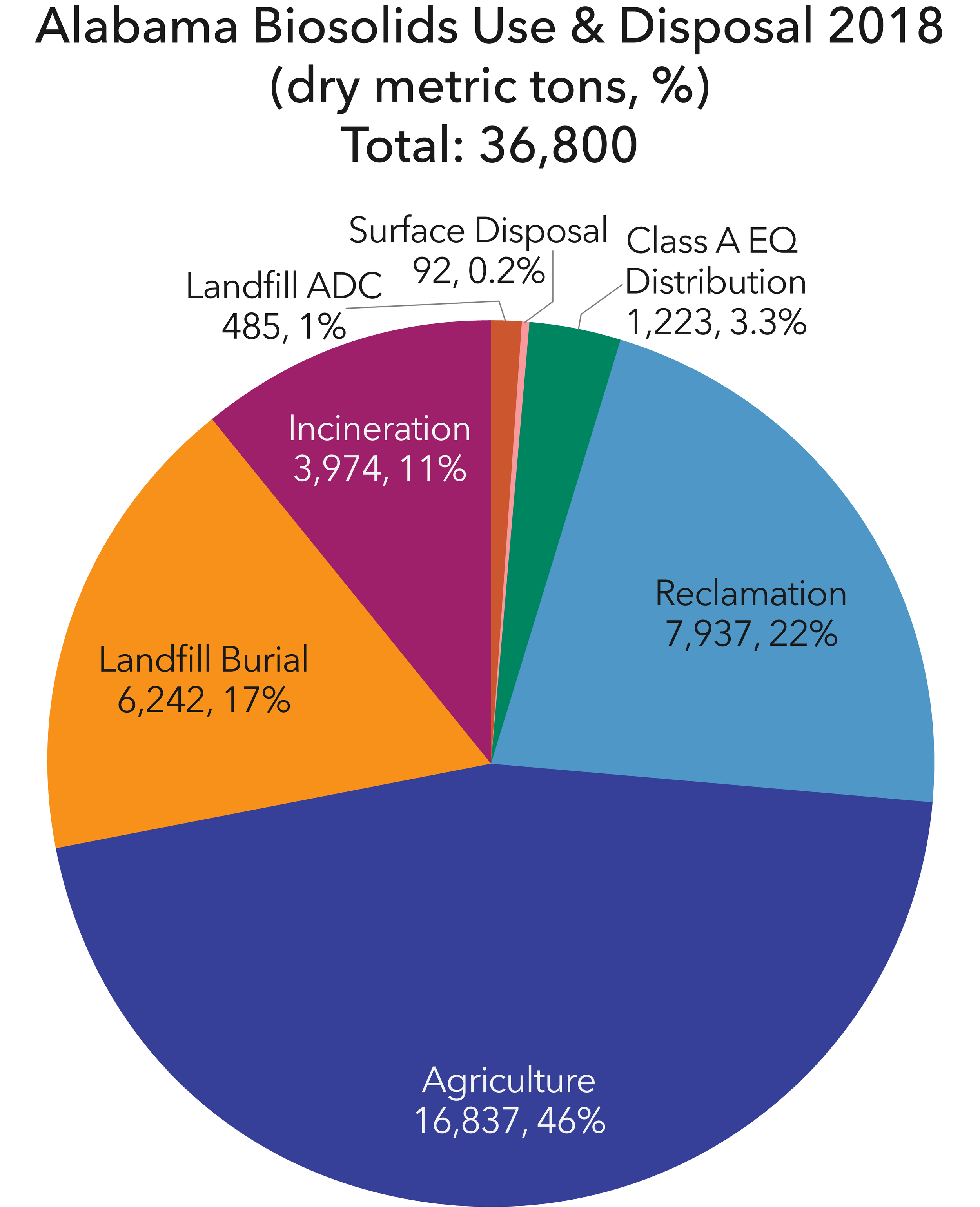 ● Most wastewater solids are land applied on farmland, with some (from the Birmingham/Jefferson County area) used for mine land reclamation. Huntsville solids are incinerated in a waste-to-energy system. The remaining solids are landfilled.