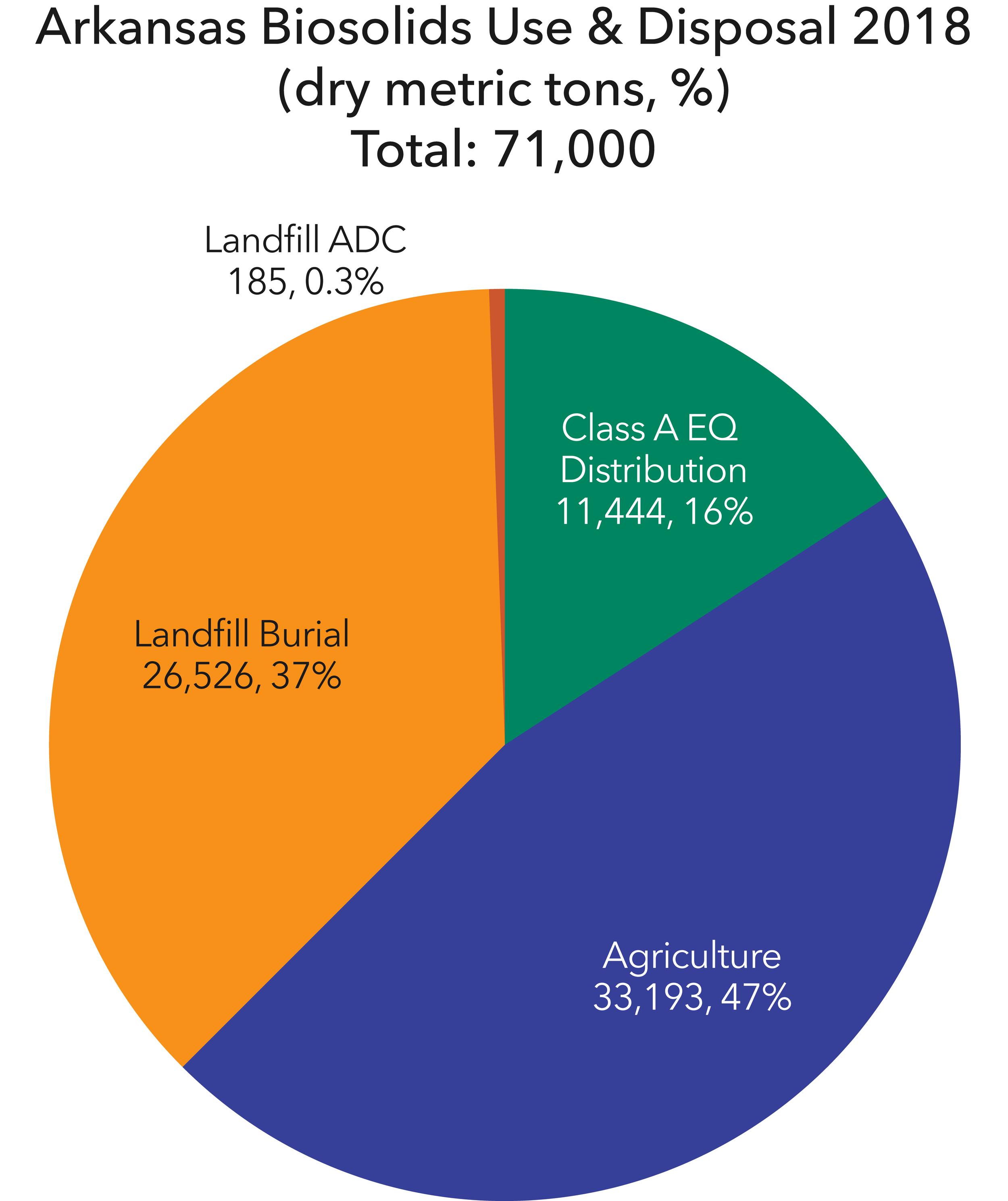 ● About 2/3rds of Arkansas biosolids are applied to agricultural or other lands to support local farms and crops. As noted by the AR Division of Environmental Quality (AR DEQ), “1000s of acres are land applied to – e.g. one contractor has 50 permits, over 600 acres per permit (but not all for biosolids, other types of waste too). Some smaller communities landfill, who don’t have land application permits nor contractors to handle [their wastewater solids].” Much of the land-applied biosolids are liquid slurries pumped from lagoons, which are common for wastewater treatment in Arkansas. These biosolids are mostly Class B, treated in a few places (e.g. Little Rock) with anaerobic digestion or alkaline stabilization, but mostly by aerobic digestion. Some Class A and EQ biosolids are produced by heat drying (e.g. Fayetteville) and composting (e.g. Hot Springs). No incineration of wastewater solids occurs in Arkansas.