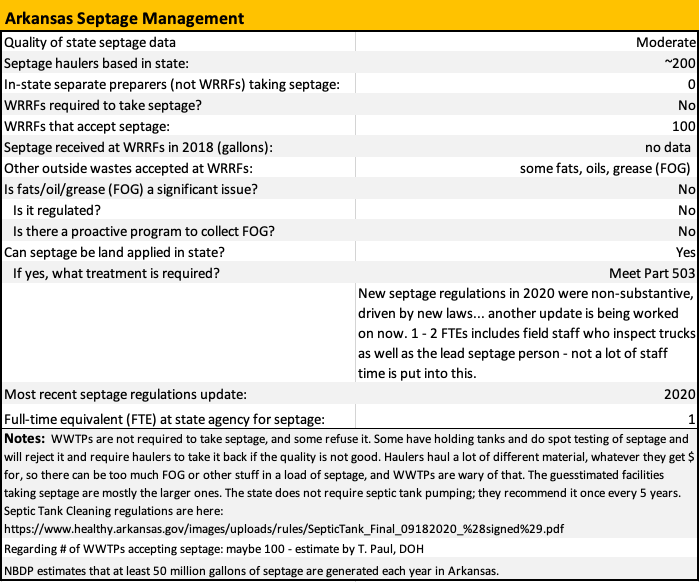 ● About 1/3 of the state’s households rely on septic systems. Septage disposal and septic systems (anything less than 1000 gallons, domestic, individual homes) are regulated through the AR Department of Health (AR DOH). Larger tanks (>1000 gallons) serving more than 20 people are permitted by both AR DOH and AR DEQ. An estimated 100 WRRFs accept septage, and that is where most AR septage goes. However, septage land application is allowed and is done some.