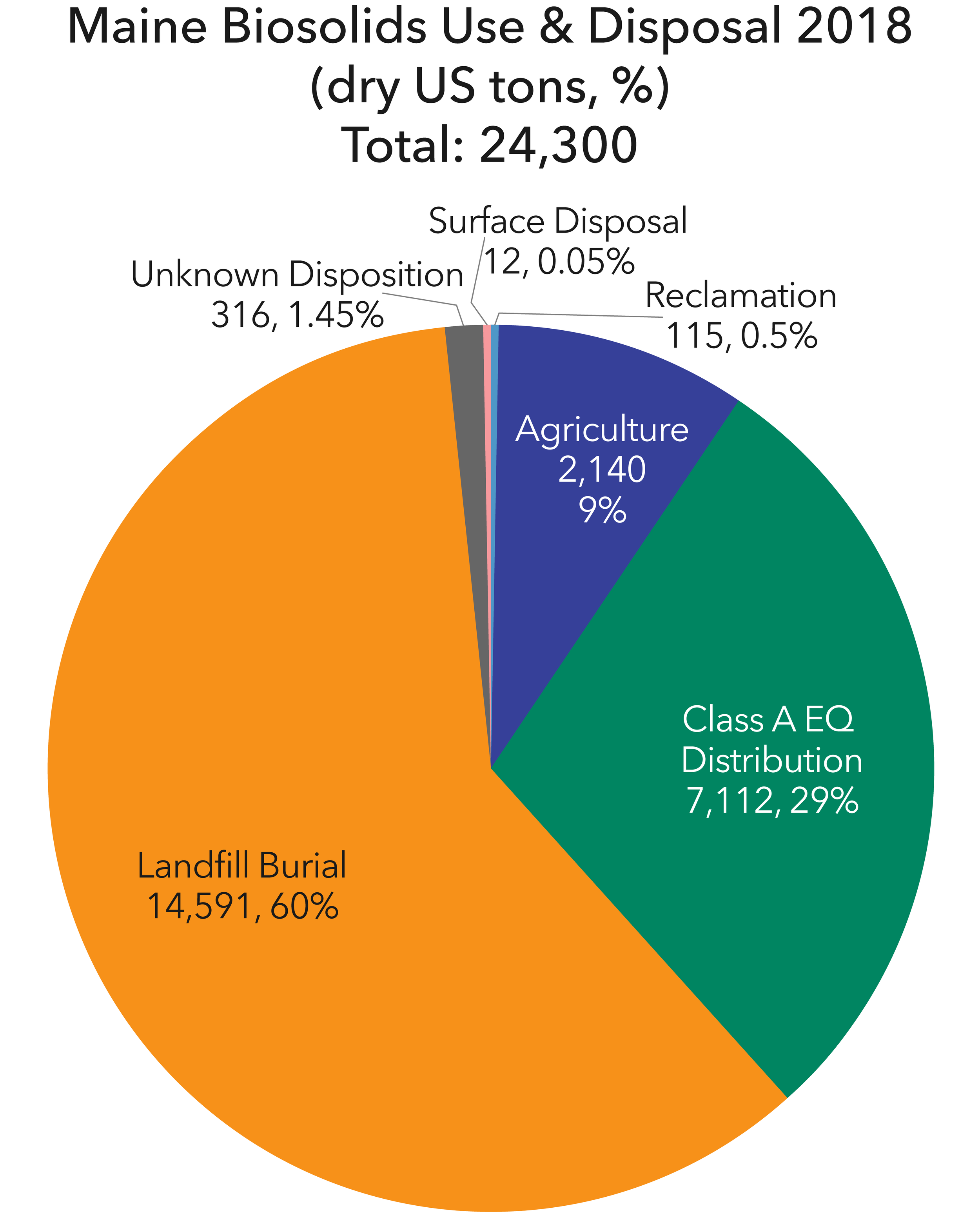 ● Class B land application was abundant in Maine in decades past, but has been diminishing since the late 2000s. In 2018, it was about 9% of all Maine wastewater solids, involving less than a dozen WRRFs, including Lewiston-Auburn (LAWPCA), Presque Isle, Mechanic Falls, Blue Hill, Grand Isle, Norridgewock, and Richmond. Class B biosolids are usually used at dairy farms for hay and feed corn crops.