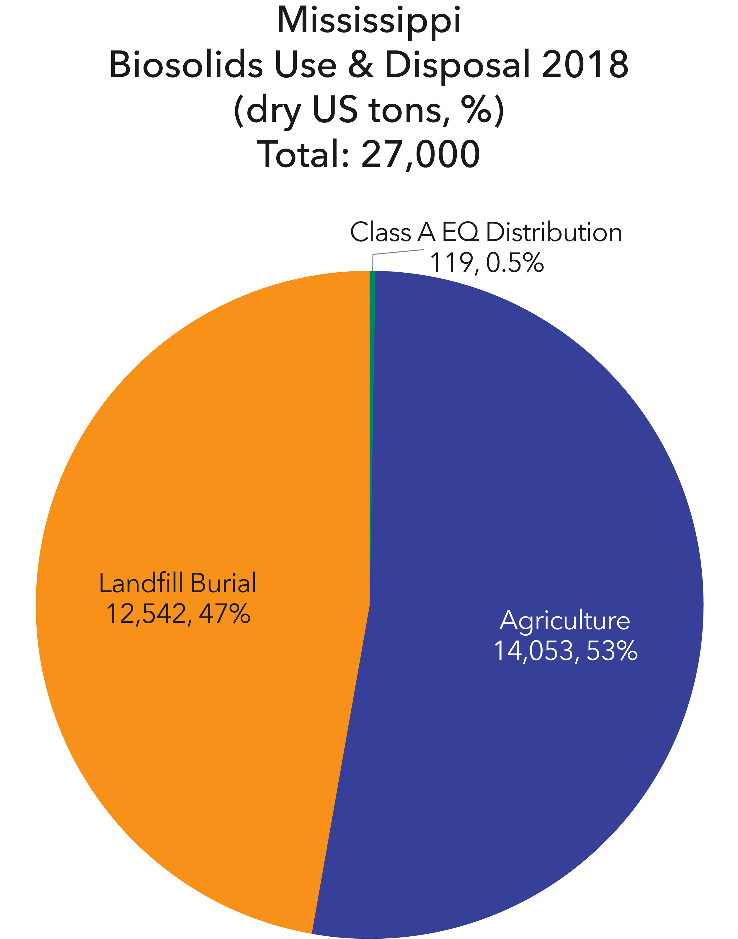 ● Land application of Class B biosolids on agricultural lands accounts for almost all of the beneficial use of biosolids in Mississippi. Jackson, the largest city (population ~164,000) land applied 4,093 dry metric tons of Class B biosolids in 2018 (and landfilled 283 dmt). The county utility authorities of Harrison (which includes Gulfport and Biloxi, the 2nd and 4th largest cities, respectively), Hancock, Pearl River, and Jackson County all land applied Class B biosolids. Jackson County (which is not near Jackson but is in southeast MS) operates four WRRFs and a land application facility at its West Jackson County WRRF, where the biosolids help grow Bermuda grass for hay sold for livestock feed.