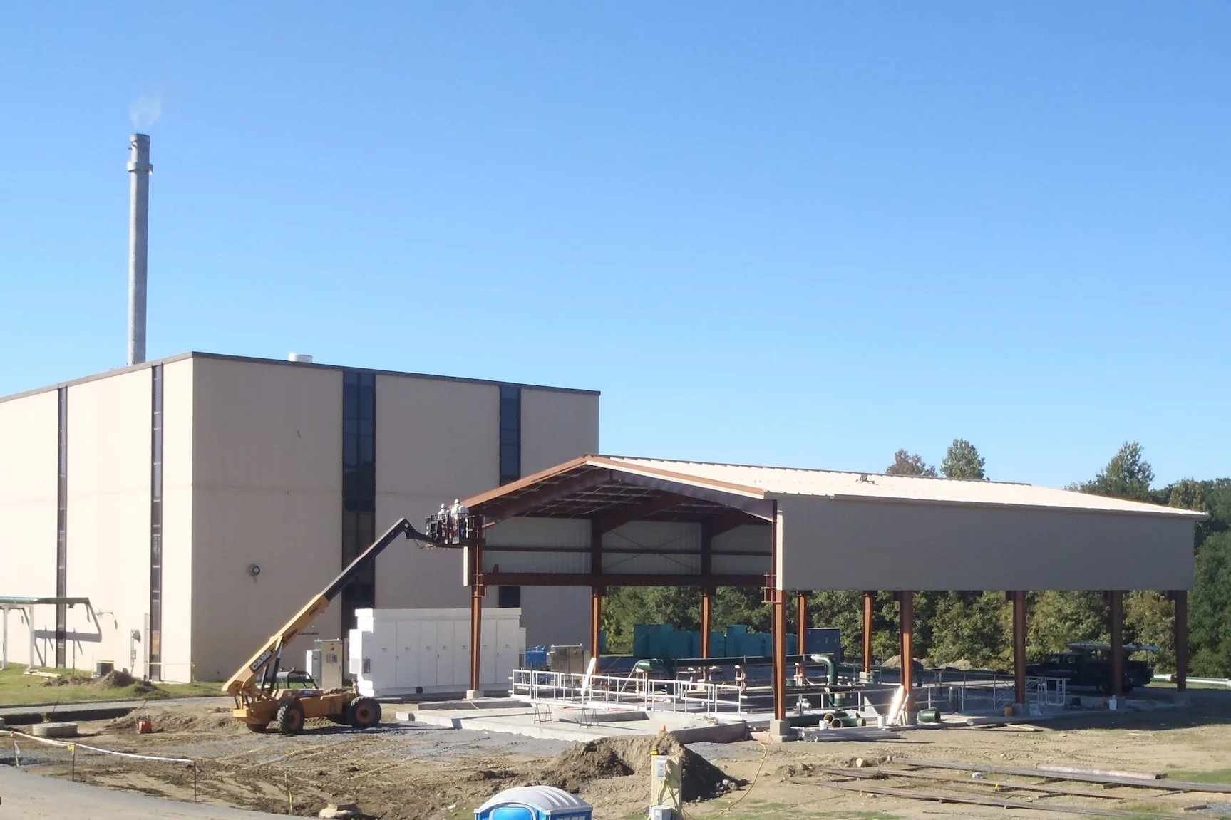 Offsite biosolids receiving bin in construction (now operating) with multiple hearth SSI behind, at Rocky River WRF in Concord, owned and operated by Water & Sewer Authority of Cabarrus Co. Photo courtesy Bob Forbes, P.E., Jacobs.