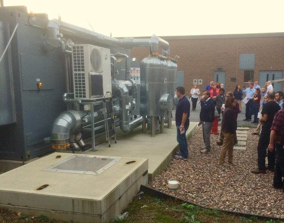 Essex Junction has long been a leading pioneer of beneficial biosolids use, including creating electricity from anaerobic digestion biogas, as shown here. These new electricity-generating engines went online in 2017 and were the highlight of a tour for wastewater operators in October 2017. Photo courtesy of NEBRA.