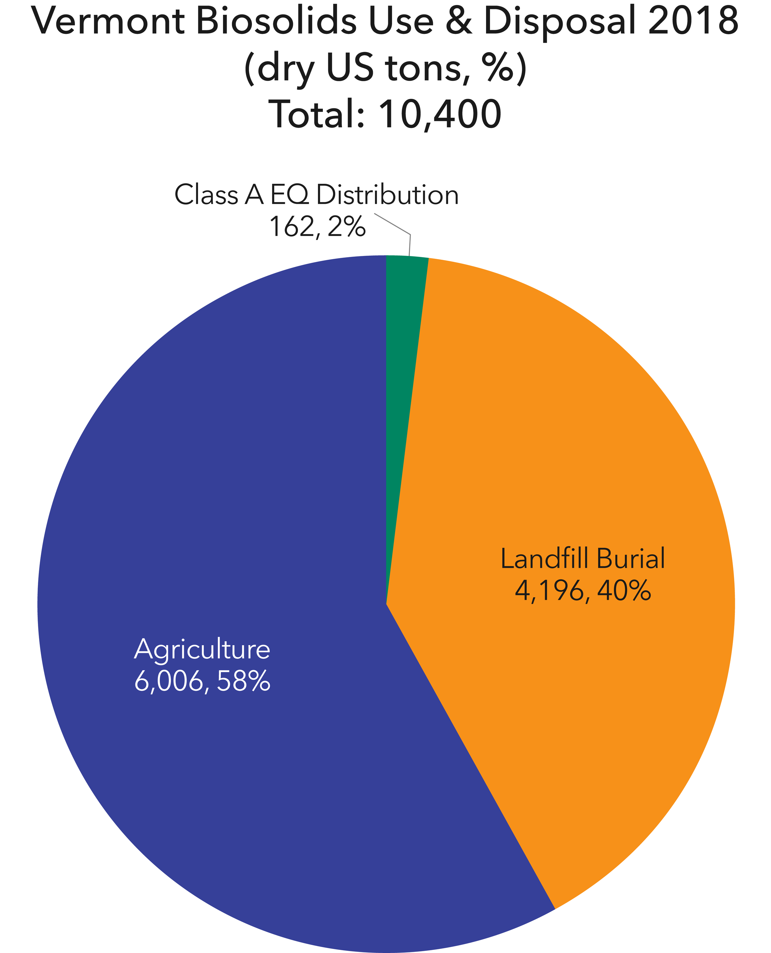 ● Vermont is a relatively small, rural state with some robust and famous local agriculture – mostly dairy (think Ben & Jerry’s and Cabot). But little local municipal biosolids is used on Vermont farms. In 2018, most was trucked from the populated Burlington area to a Chateaugay, New York alkaline stabilization facility owned and operated by Casella Organics. The resulting bulk Class A EQ biosolids were land applied on farms in northern New York and southern Quebec.