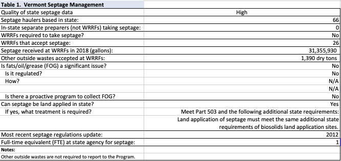 ● Vermont biosolids, septage, and other residuals are overseen by the state’s Department of Environmental Conservation, Waste Management and Prevention Division, with strict permitting and regulation of all forms of residuals management. Details at https://dec.vermont.gov/waste-management/residuals-management, which includes a thorough May 2018 report (https://dec.vermont.gov/sites/dec/files/wmp/residual/RMSWhitePaper20180507.pdf).